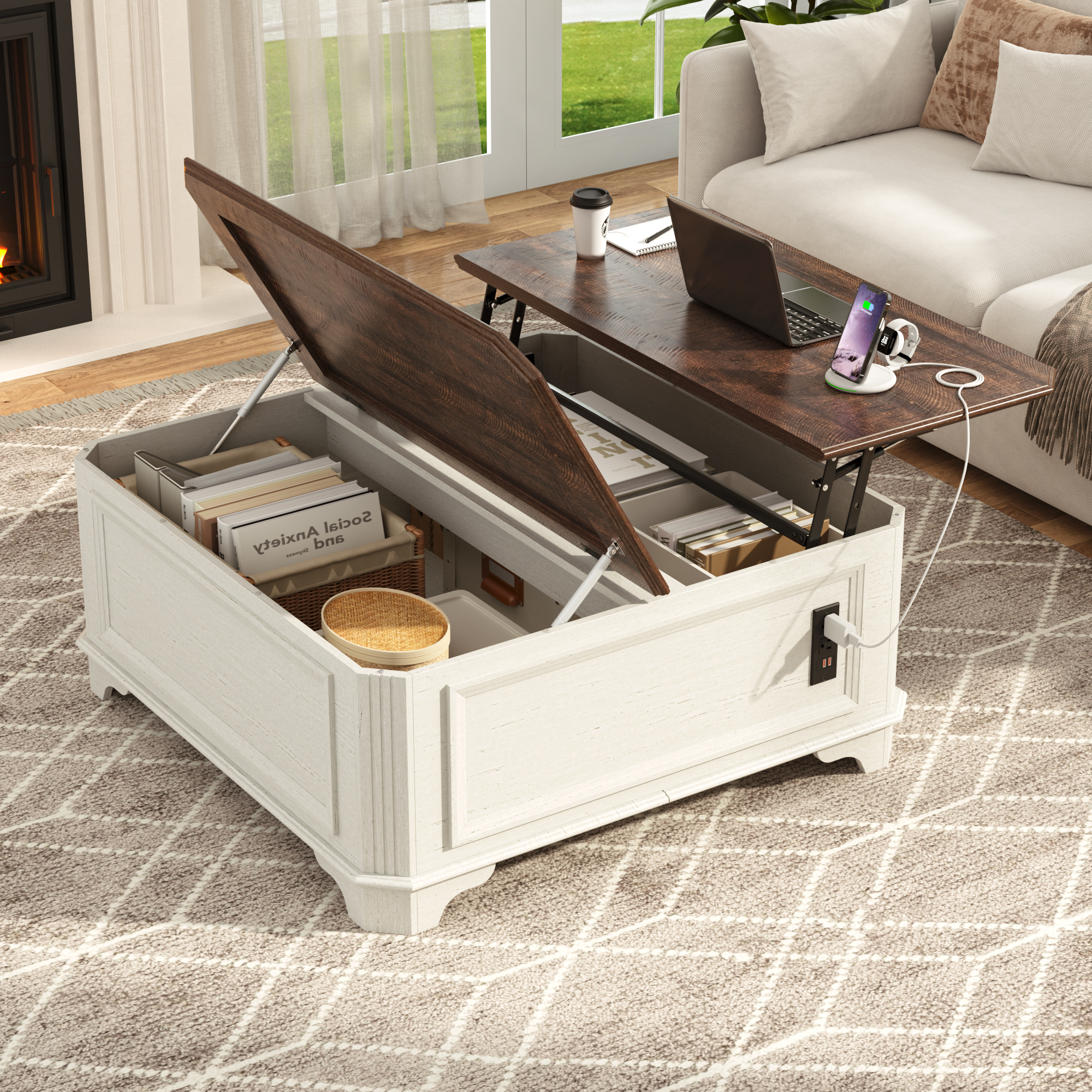 2. Spacious Hidden Storage Space: Beneath the lift-up desktop lies a spacious, compartmentalized storage space to keep your living room tidy. You can store books, magazines, blankets, remote controls, and other household items, keeping the space organized. Internal shelves help organize items, while open lower storage provides easy access to frequently used items such as baskets or decorative boxes.