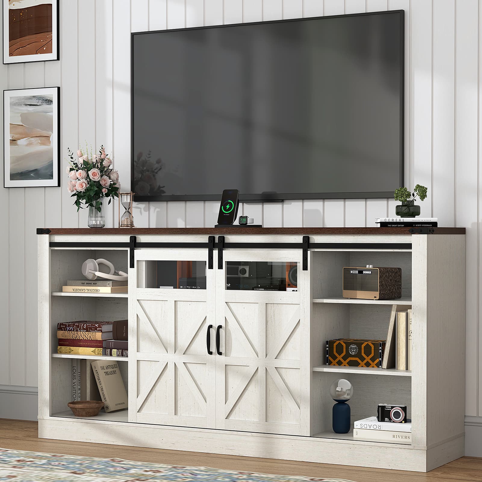 Designed in a style that blends farmhouse elements with a modern look, using a combination of slidding barn doors and modern clear glass decor, our farmhouse TV stand is beautiful and well made for a beautifully atmospheric look. 66" tabletop can support for up to 65" 70" even 75" TVs, also roomy for family photos, potted plants and other decorations without being cramped. Extra open shelves and two slidding doors which hide piles and piles of family games and all the components!