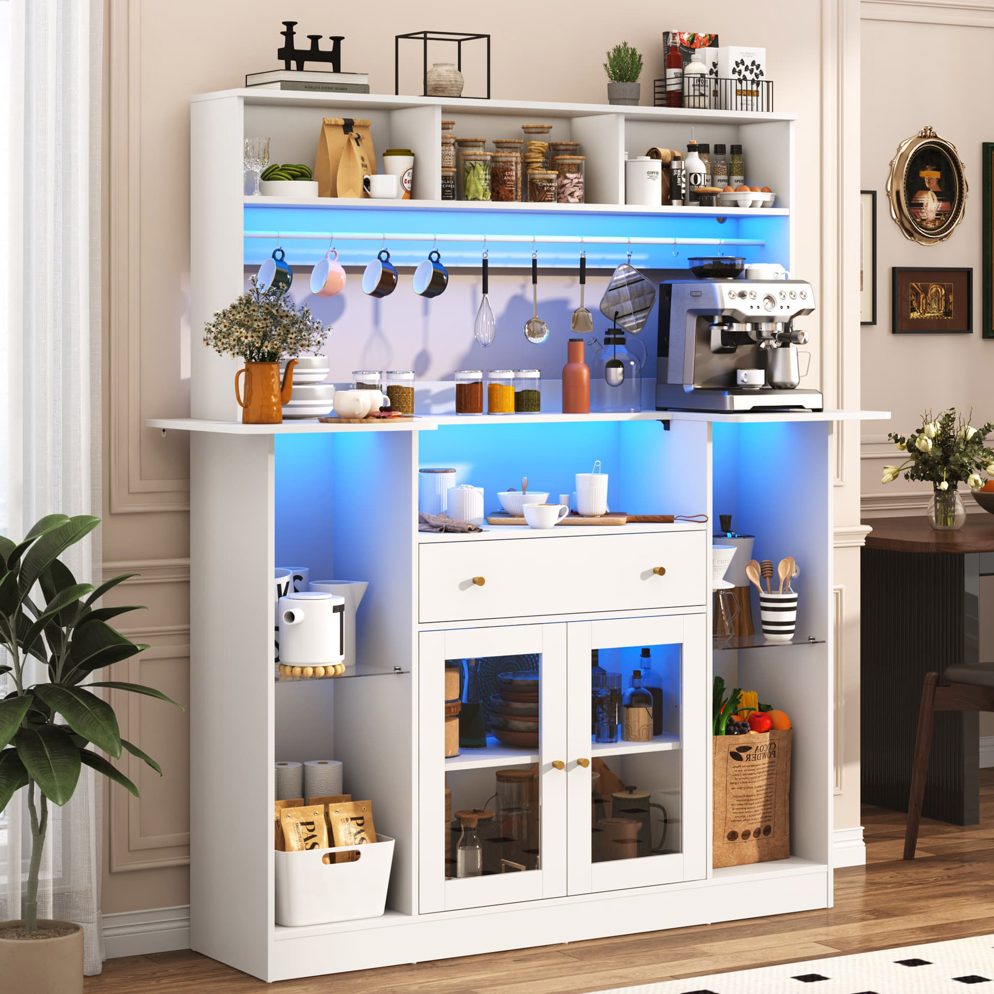 - 【LED Lights & Glass Doors】Enhance your coffee experience with this coffee bar cabinet featuring an LED light strip and glass cabinet doors. The LED lights create a mesmerizing ambiance and enhance visibility, making it easier to locate and select your preferred coffee cups and coffe beans. The glass doors allow you to showcase coffee cups while protecting them from dust and maintaining their optimal conditions. The LED Lights combined with the glass doors create a visually appealing display for your coffee collection.
