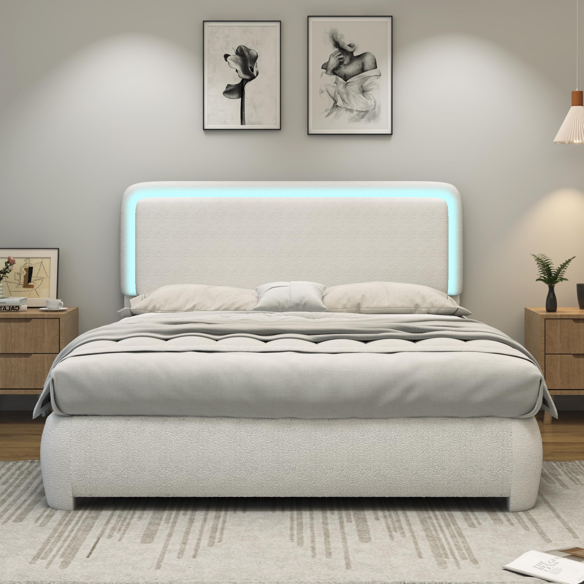 Queen/King Size Bed Frame with LED Light, Boucle Upholstered Platform Bed with Adjustable Headboard, Soft Rounded Corners