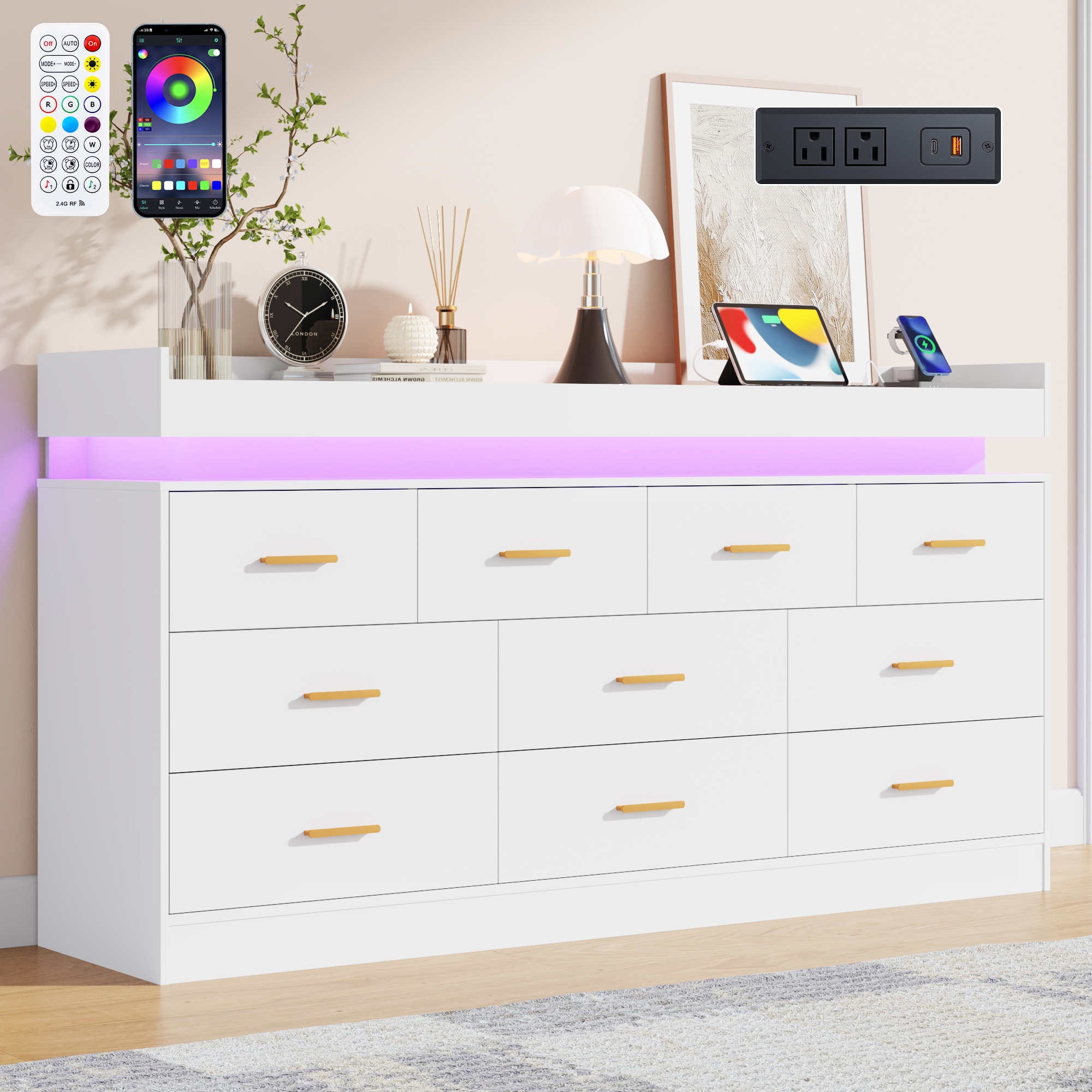 This wooden dresser features 16 spacious drawers to store clothes, linens and more. The dresser is made of high-quality wood, and each drawer has smooth metal slides, making this wooden cabinet waterproof, scratch-resistant, wear-resistant, and easy to push and pull. This 16 Drawer Double Dresser comes with beautiful multicolor RGB LED light. You can control the light strip through the included remote or APP to freely change colors, adjust brightness, or customize modes. Light and bright, this dresser is inspired by chic designs. The perfect fusion of classic design and modern lifestyle.