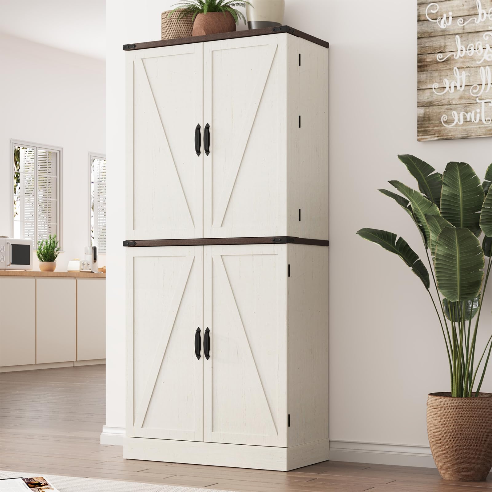6、Multi-Purpose Farmhouse Storage Cabinets:This Storage Cabinet can be used as kitchen cabinet,craft cabinet,food pantry cabinet,bathroom storage cabinet and so on, Transform your kitchen cabinets from cluttered, hard-to-reach spaces into efficient, organized storage havens, perfect for cabinets, kitchen, pantry,bathroom,living room,office,and more.It can be placed in any space in your home that needs storage to keep your home neat and tidy.