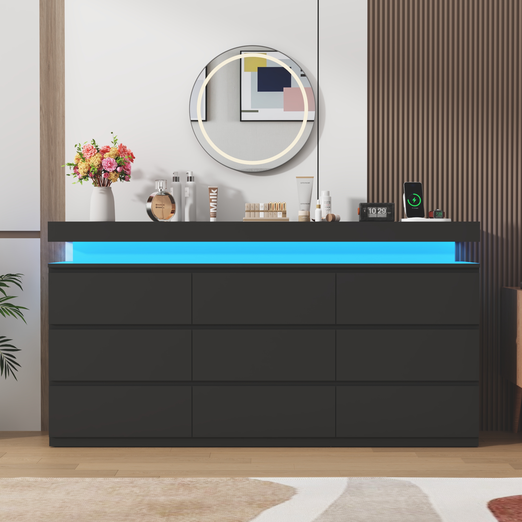 This wooden dresser features 9 spacious drawers to store clothes, linens and more. The dresser is made of high-quality wood, and each drawer has smooth metal slides, making this wooden cabinet waterproof, scratch-resistant, wear-resistant, and easy to push and pull. This 9 Drawer Double Dresser comes with beautiful multicolor RGB LED light. You can control the light strip through the included remote or APP to freely change colors, adjust brightness, or customize modes. Light and bright, this dresser is inspired by chic designs. The perfect fusion of classic design and modern lifestyle.
