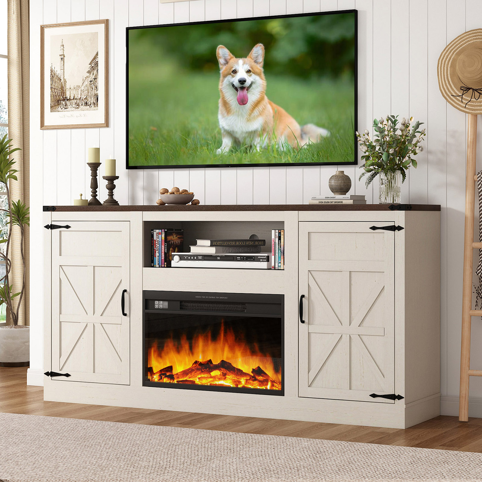 - Farmhouse Electric Fireplace TV Stand: Our farmhouse TV stand with 26 inch electric fireplace, adopts a beautiful farmhouse style appearance, metal corners, barn door design, and distinctive distressed antique finish. Giving every piece a unique look and creating a charming, rustic and cozy atmosphere and is a good decor for living room and room.