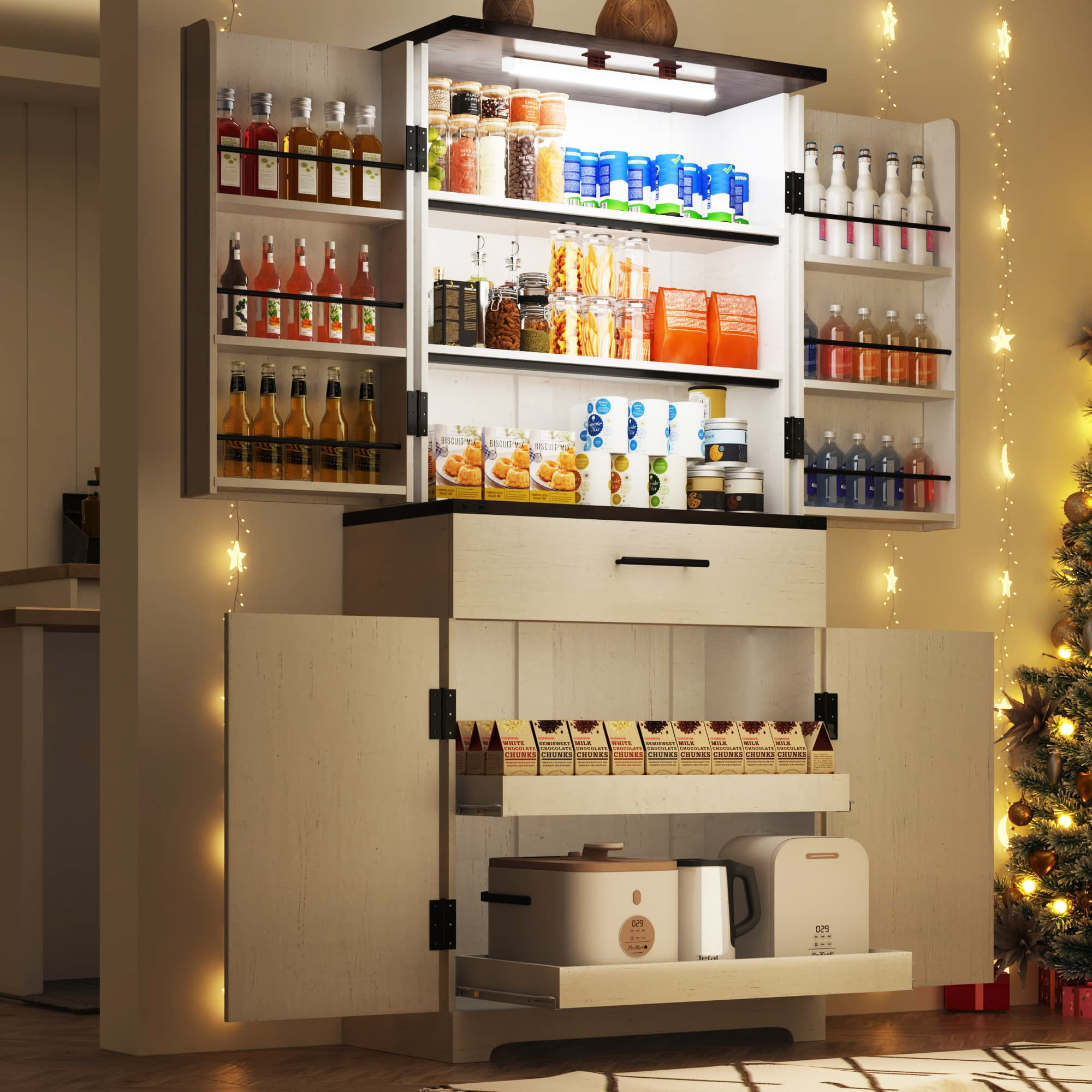 4、Sturdy and Stable: Tall pantry cabinets for kitchen storage is made of premium engineered wood and metal, with whole frame thickened wood boards and reinforced structural support.The middle and bottom shelves features well-structured design and max load 100 lbs and other shelves can be hold 50 lbs each. Extra wall connection attachments kit double ensure the whole food pantry cabinet safe and is not easy wooble and shake.